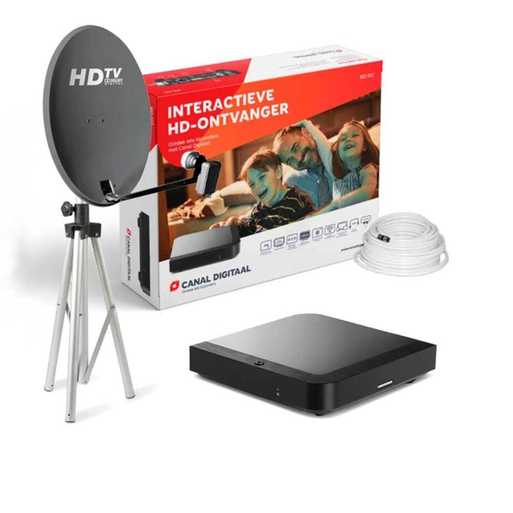 Met de M7 CDS MZ104 HD RecreatieSet van CanalDigitaal geniet u overal van haarscherpe HD-televisie. Deze complete satellietset is speciaal ontworpen voor gebruik op de camping, in de caravan, camper of vakantiehuis. Dankzij de eenvoudige installatie en compacte onderdelen heeft u binnen enkele minuten toegang tot uw favoriete Nederlandse en internationale tv-zenders.